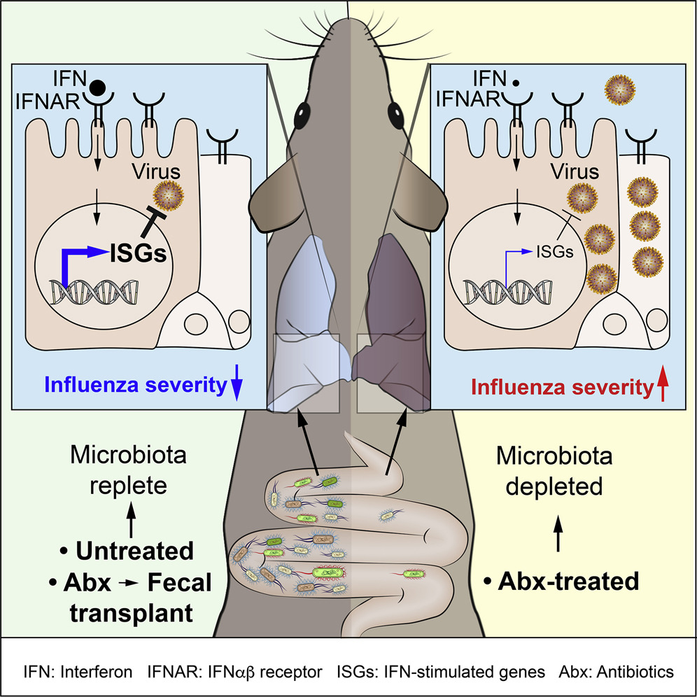 讓人震驚的是,服用抗生素的小鼠在受到流感病毒感染后,腸道中能產(chǎn)生“I型干擾素信號“的有益細菌竟被“誤殺”,從而抑制抗病毒基因的開啟,降低了肺部基質細胞的免疫應答效率,讓流感感染變得更加嚴重。