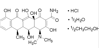 別名鹽酸強力霉素 ;脫氧土霉素鹽酸鹽,鹽酸多西環素,6-甲基-4-(二甲氨基)-3,5,10,12,12a-五羥基-1,11-二氧代-1,4,4a,5,5a,6,11,12a-八氫-2-并四苯甲酰胺鹽酸鹽 ;Doxycycline hydrochloride hemiethanolate hemihydrate