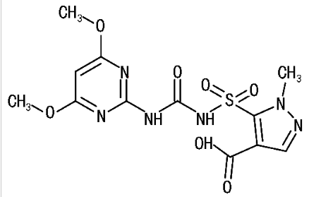 別名 吡嘧磺隆 ;草克星;5-(4,6-二甲氧基嘧啶-2-基氨基甲酰氨基磺酰基)-1-甲基吡唑-4-羧酸;5-((4,6-dimethoxypyrimidin-2-ylcarbamoyl)sulfamoyl)-1-methylpyrazole-4-carboxylic acid; 5-(((((4,6-dimethoxy-2-pyrimidinyl)amino)carbonyl)amino)sulfonyl)-1-methyl-1h-pyrazole-4-carboxylic acid